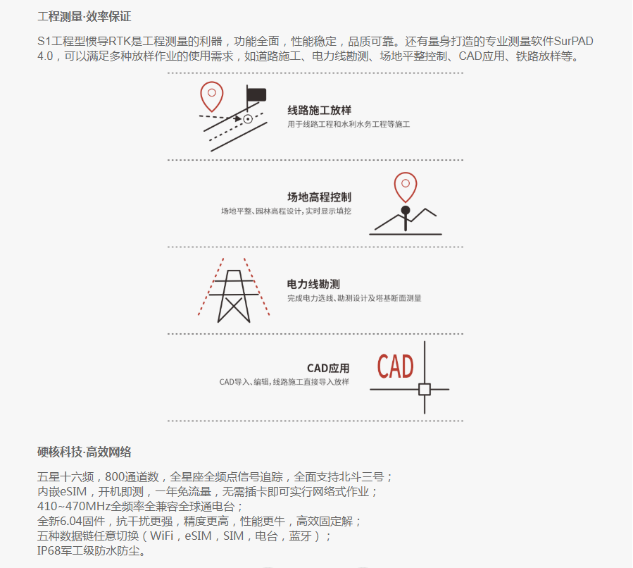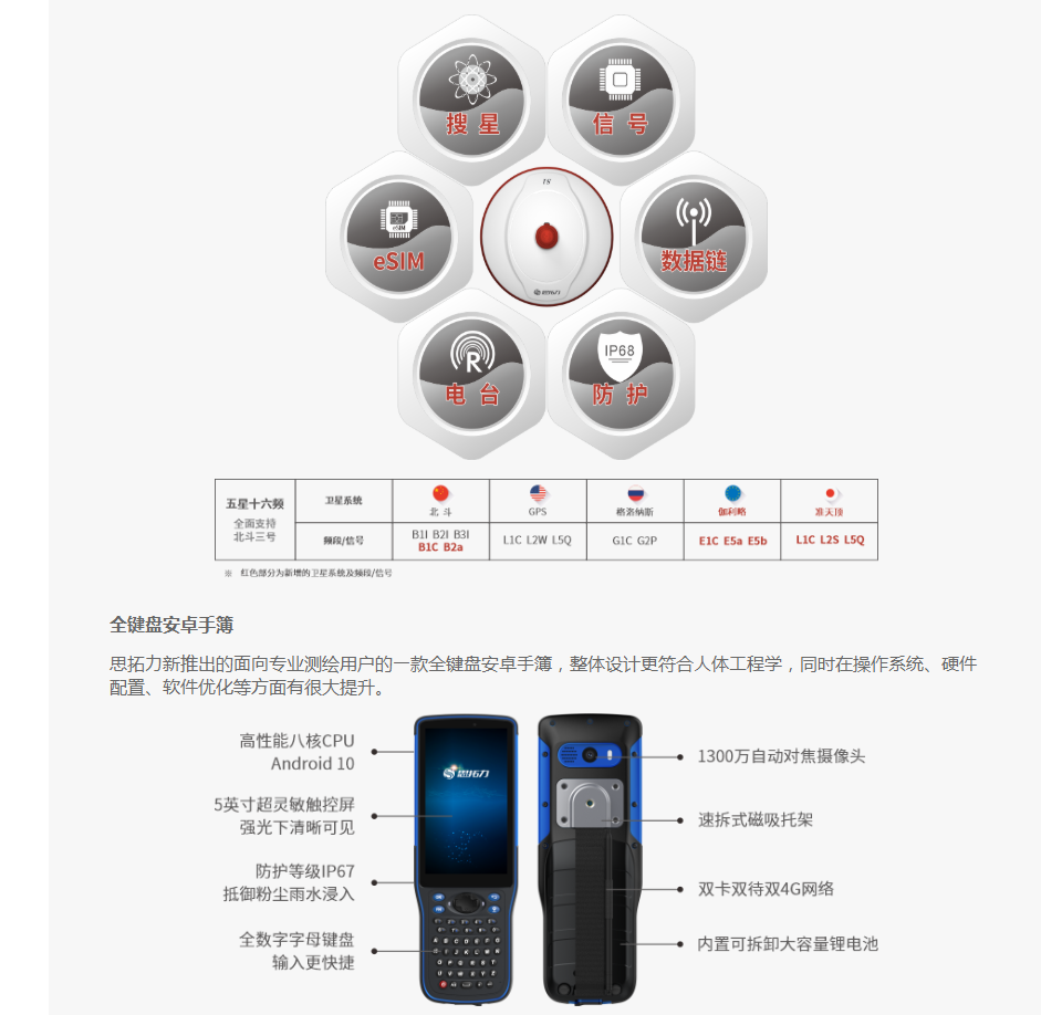 產品描述:S1 ?程型慣導RTK,搭載基于“天琴”?代芯片的全尺寸高精度定位板卡,全星座全頻點信號追蹤(五星?六頻),全面支持北斗三號;內嵌eSIM,開機即測,一年免流量,無需插卡即可實行網絡式作業;預裝思拓力第四代慣導傾斜測量技術(需單獨開通),顯著提升?程放樣效率。