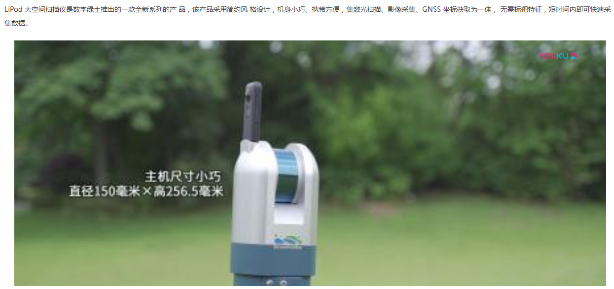 產品描述:LiPod 大空間掃描儀是數字綠土推出的一款全新系列的產 品,該產品采用簡約風 格設計,機身小巧、攜帶方便,集激光掃描、影像采集、GNSS 坐標獲取為一體, 無需標靶特征,短時間內即可快速采集數據。